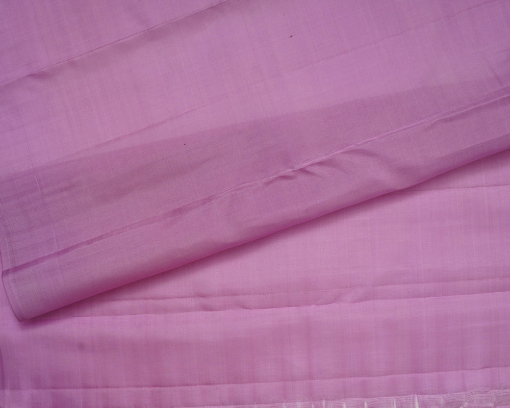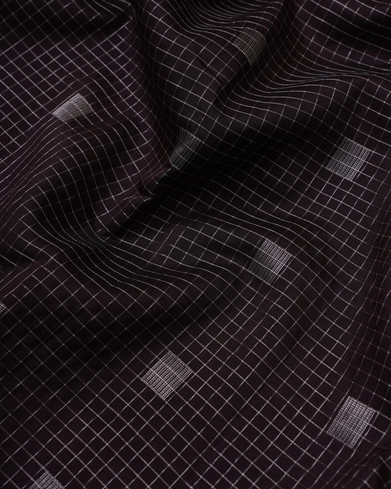 The brown Kanjivaram silk saree is adorned with vertical zari weaving, accented by intricate geometrical butta designs throughout. The saree features a self-matching geometrical border and pallu, adding a touch of traditional elegance. It is paired with a plain blouse that includes a matching border, completing the classic and sophisticated look.