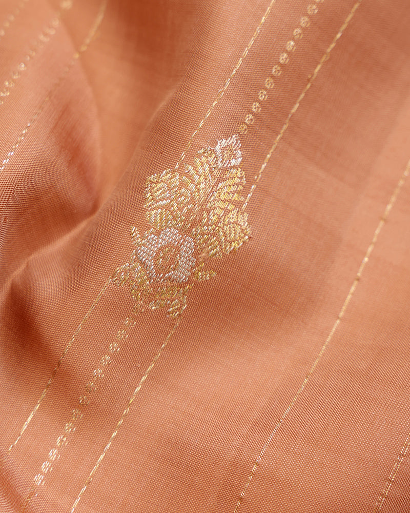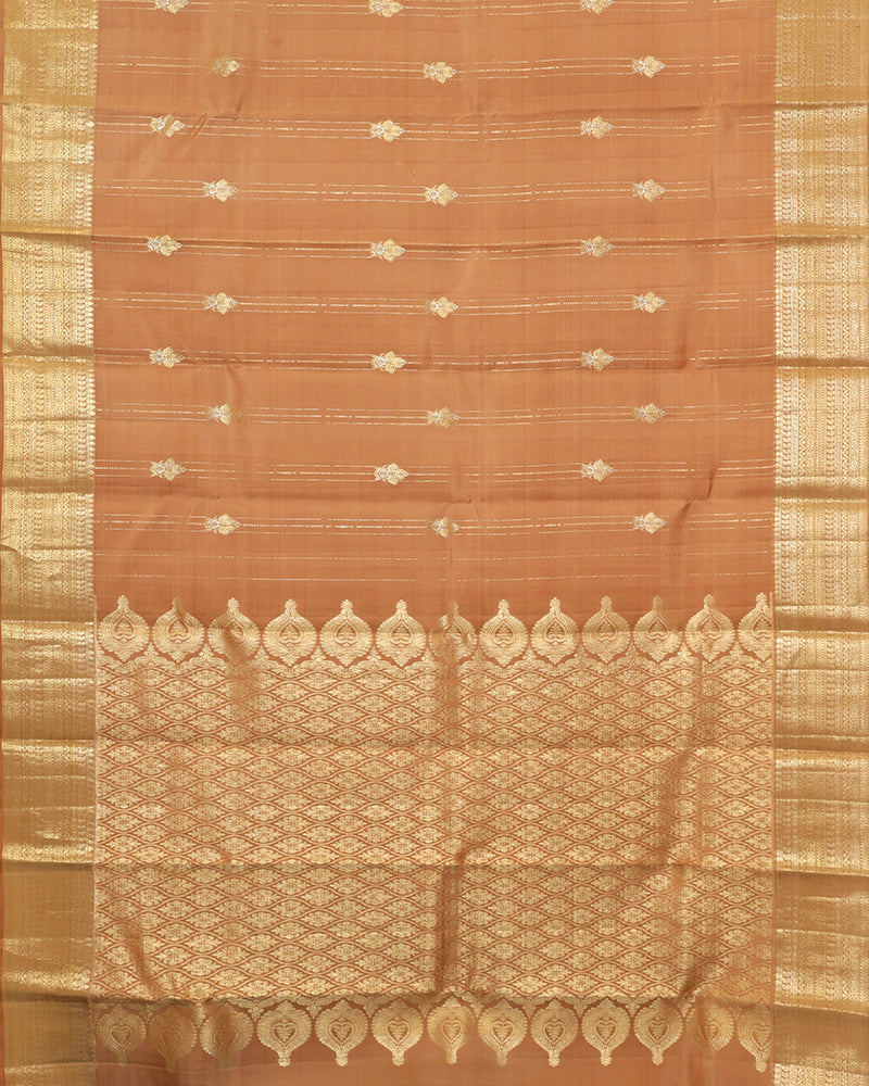In the timeless elegance of an earth brown Kanjivaram silk saree, vertical lines and butta weaving in...