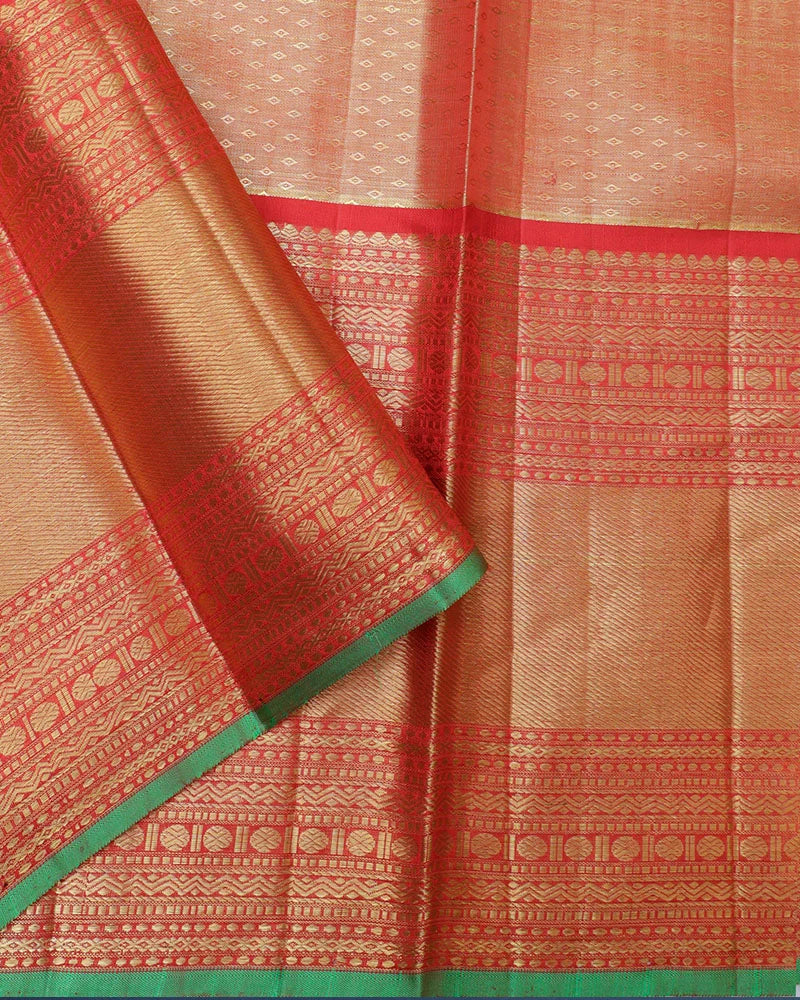 Exuding regal elegance, the gold tissue Kanjivaram saree is a masterpiece adorned with intricate paisley and floral...