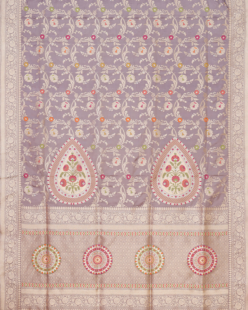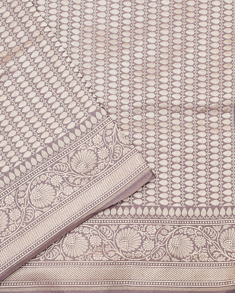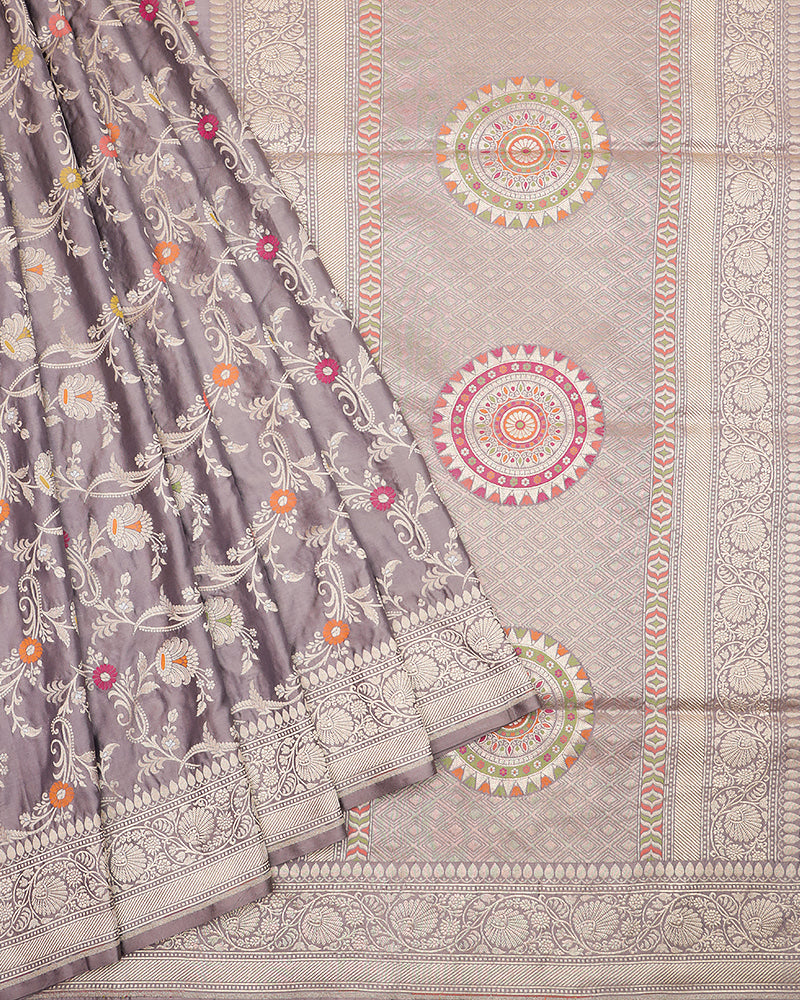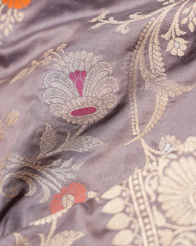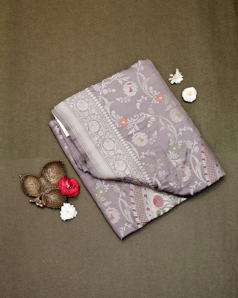 The grey Katan Banarasi silk saree boasts intricate floral jaal weaving all over, exuding understated elegance and sophistication. Its self-floral pallu and border add a touch of traditional charm and continuity to the design. Paired with a plain blouse featuring a coordinating border, this ensemble is perfect for special occasions, combining timeless beauty with modern simplicity.