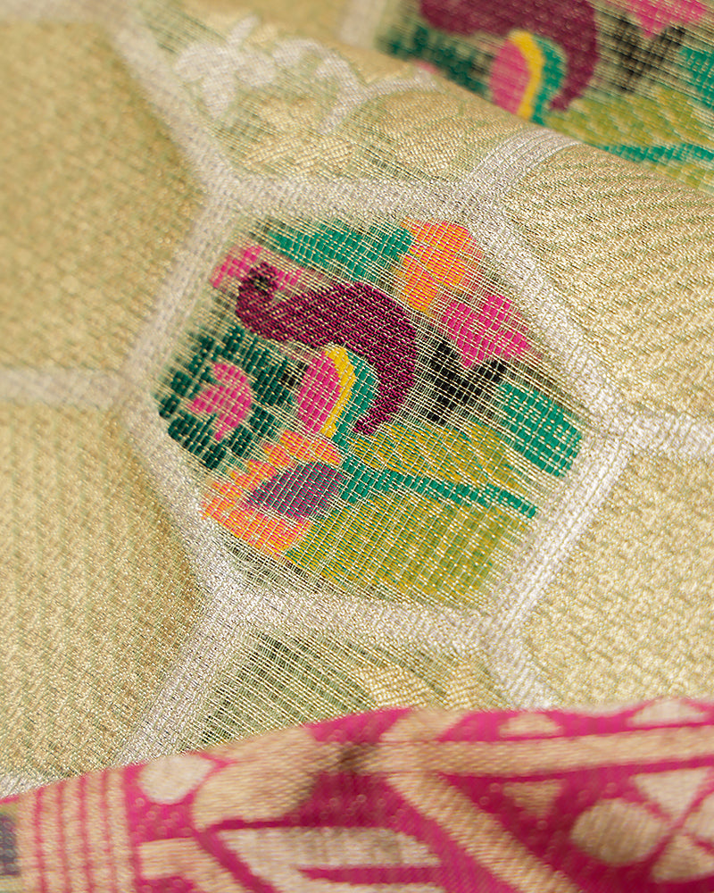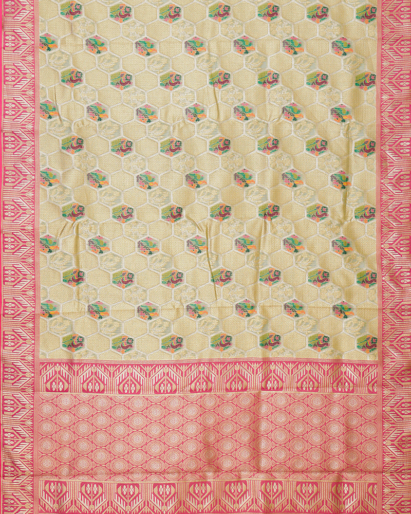 This exquisite light brown Kota fancy saree features intricate geometrical patterns and peacock flower butta weaving throughout, creating a stunning and elegant design. The saree is beautifully complemented by a contrast geometrical border and pallu, adding a unique touch of sophistication. Paired with a plain blouse that includes a matching border, this saree is perfect for special occasions, seamlessly blending traditional charm with modern elegance.