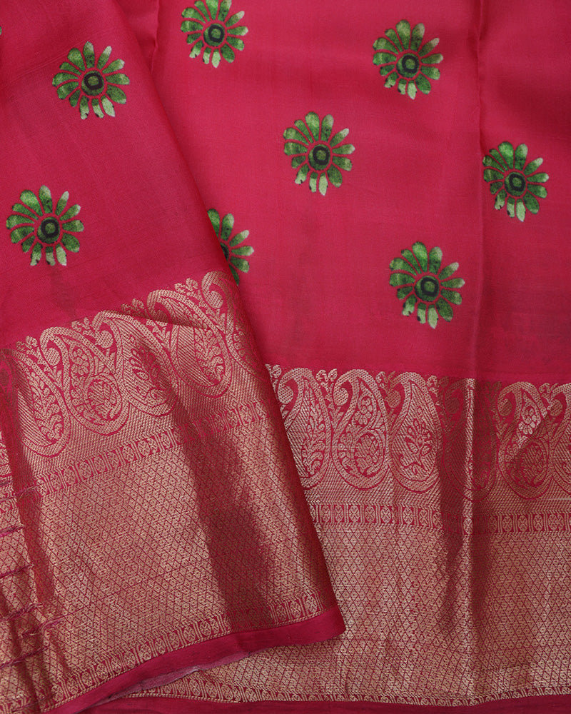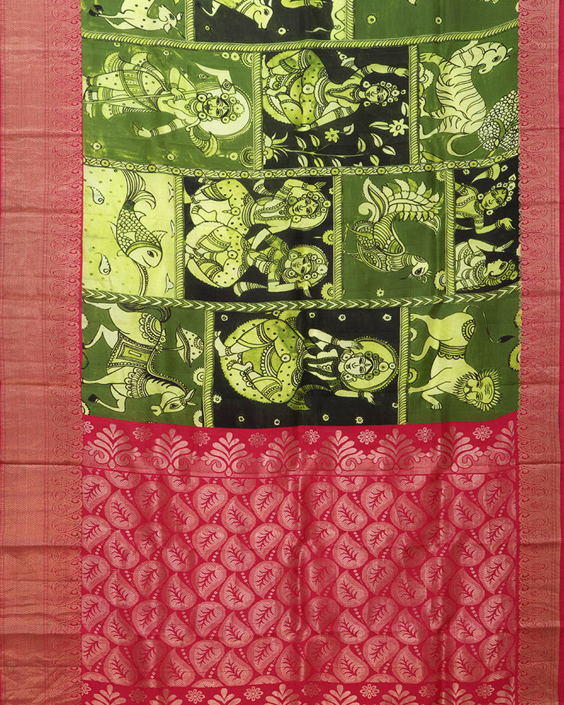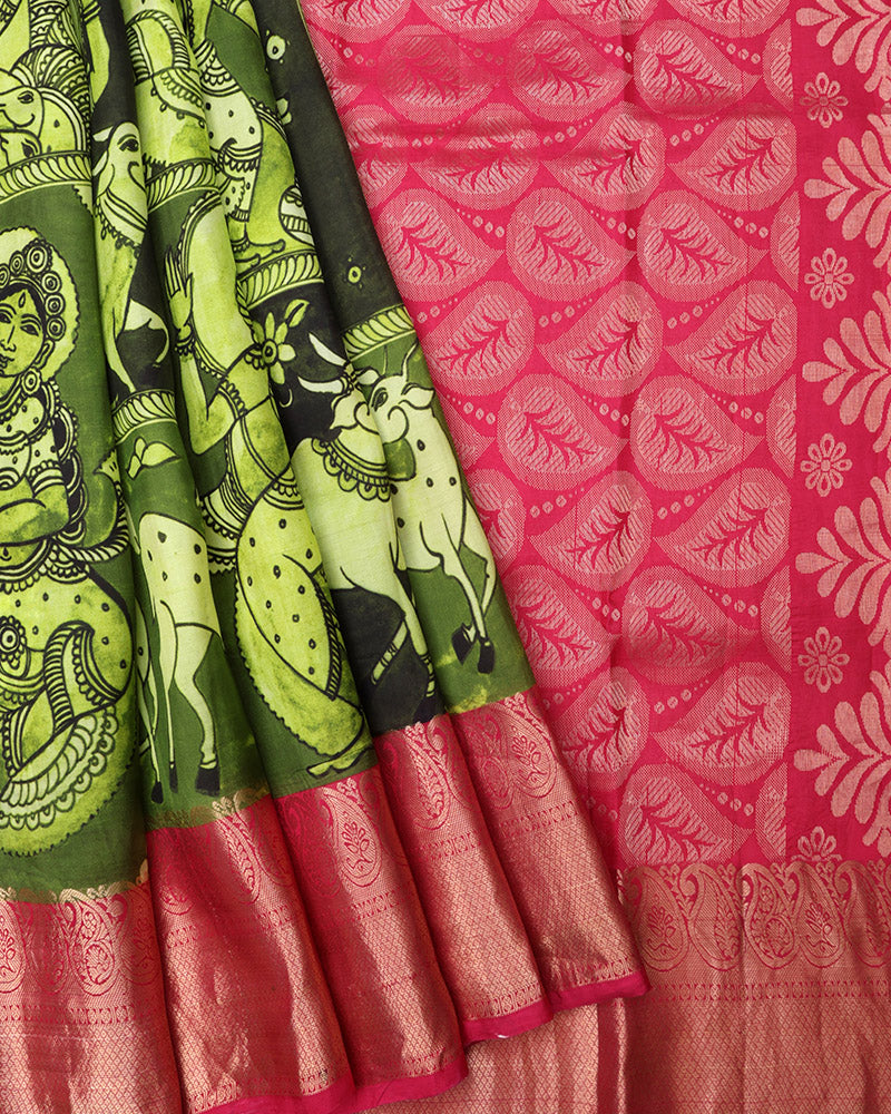 In the captivating shade of Mehendi green, this Kanchivaram silk saree boasts a mesmerizing pichwai print adorned...
