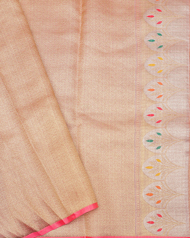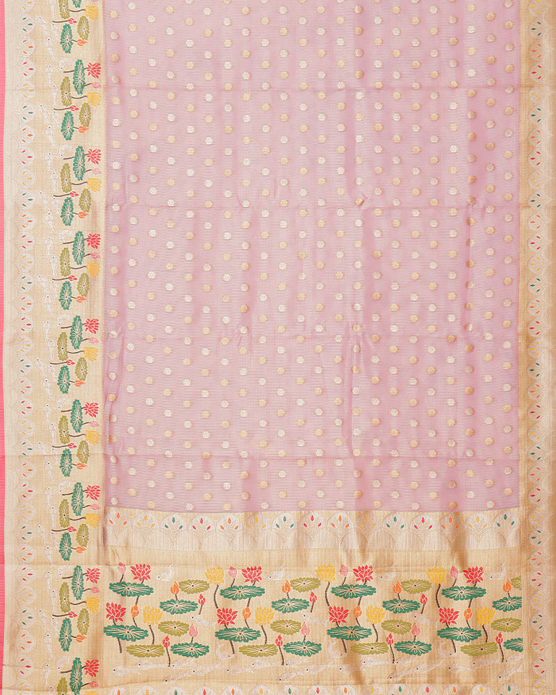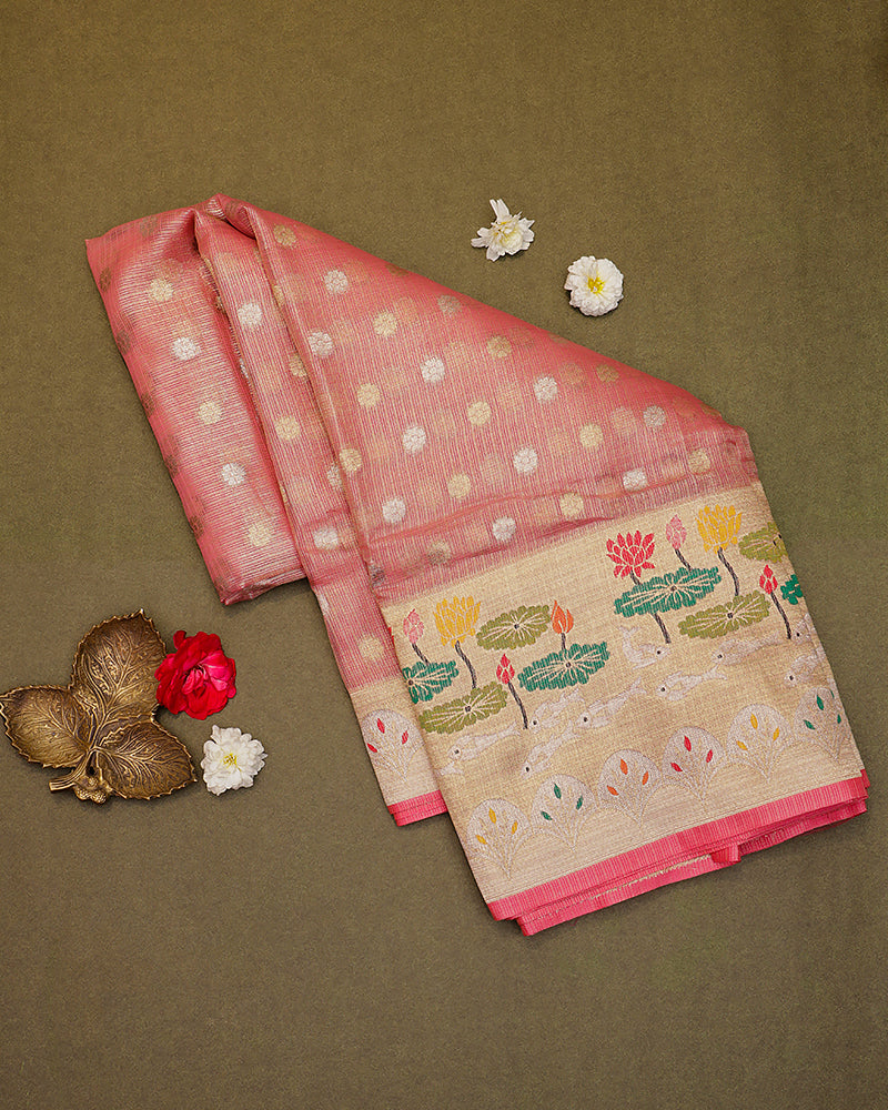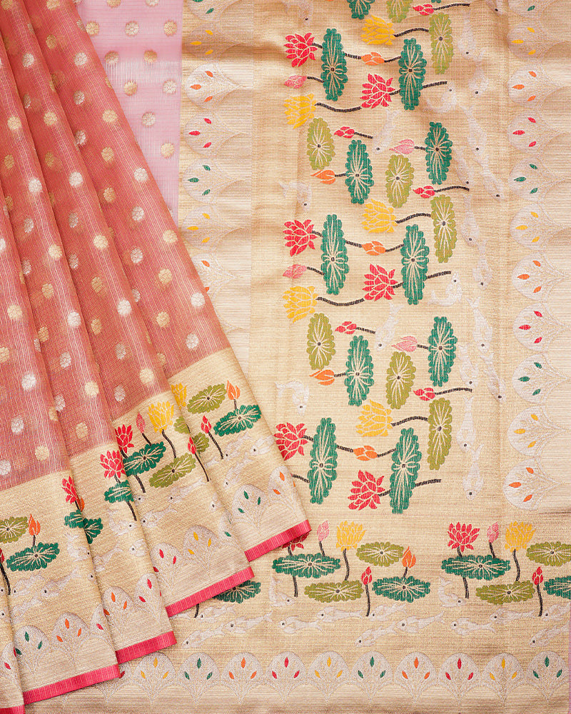 This exquisite onion pink Kota fancy saree features delicate butta weaving throughout, offering a refined and elegant look. The saree is beautifully enhanced by a self-gold lotus meenakari weaving border and pallu, adding a touch of opulence. Paired with a plain blouse that includes a matching border, this saree is perfect for special occasions, combining timeless beauty with sophisticated craftsmanship.
