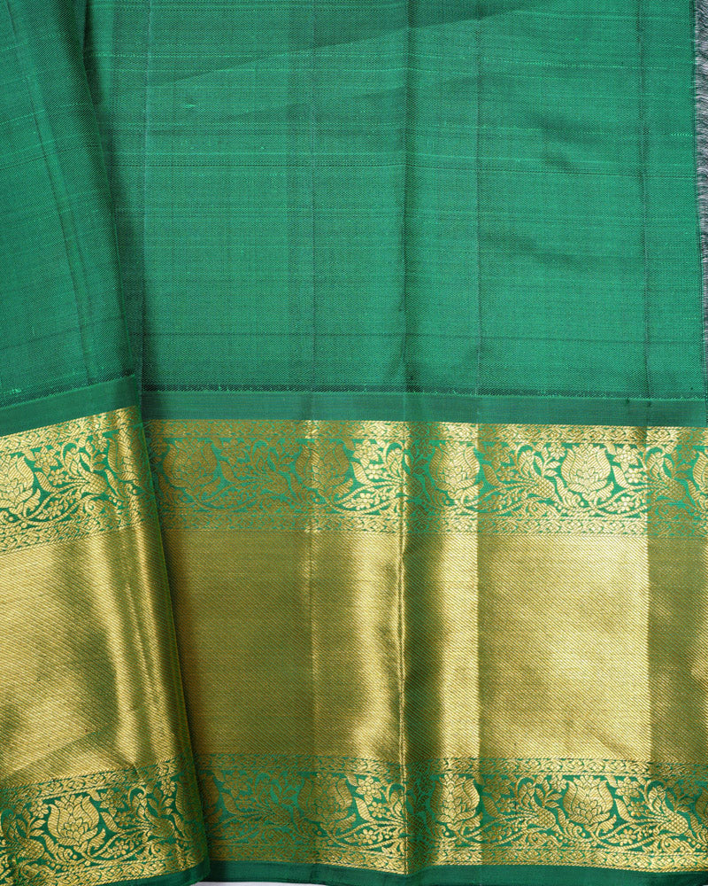 This elegant peach pink Kanjivaram silk saree features an intricate check pattern with silver zari weaving throughout, adding a touch of sophistication and shimmer. The saree is beautifully contrasted by a green floral border and pallu, enhancing its vibrant and traditional appeal. Paired with a blouse that has coordinating details, this ensemble is perfect for special occasions, blending timeless artistry with contemporary elegance.