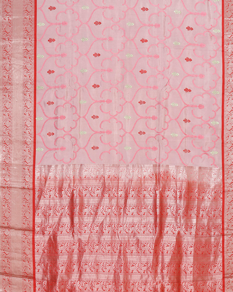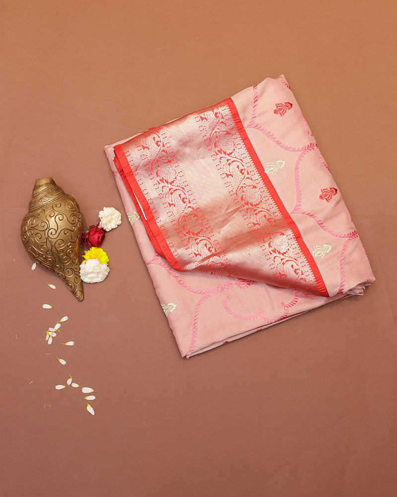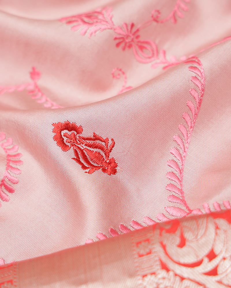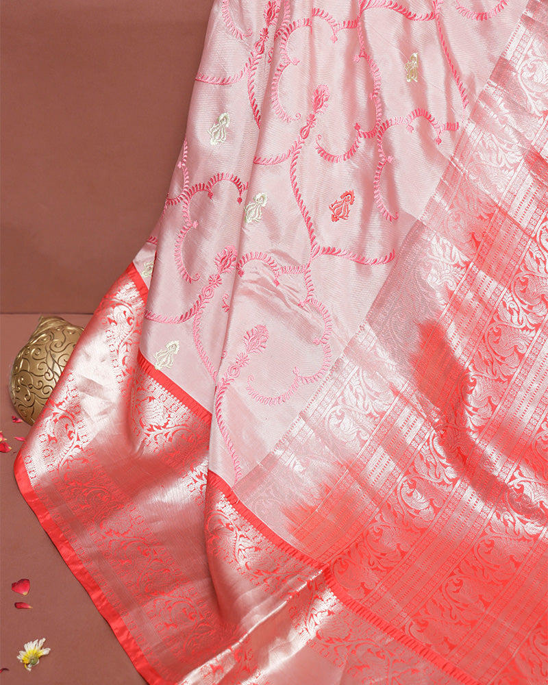 Picture yourself adorned in the ethereal beauty of a light baby pink Kanchi embroidery saree, featuring a...