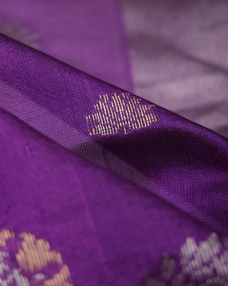 The purple Chanderi silk saree is a delightful creation, adorned with intricate rudraksha butta weaving all over....