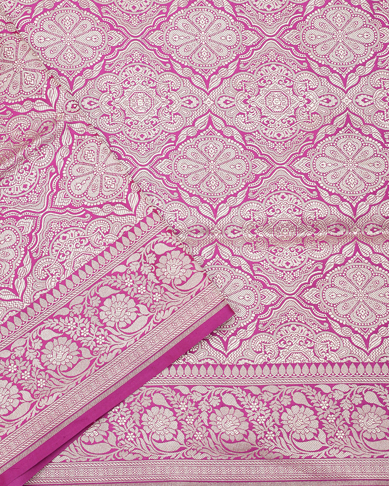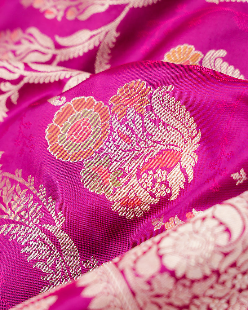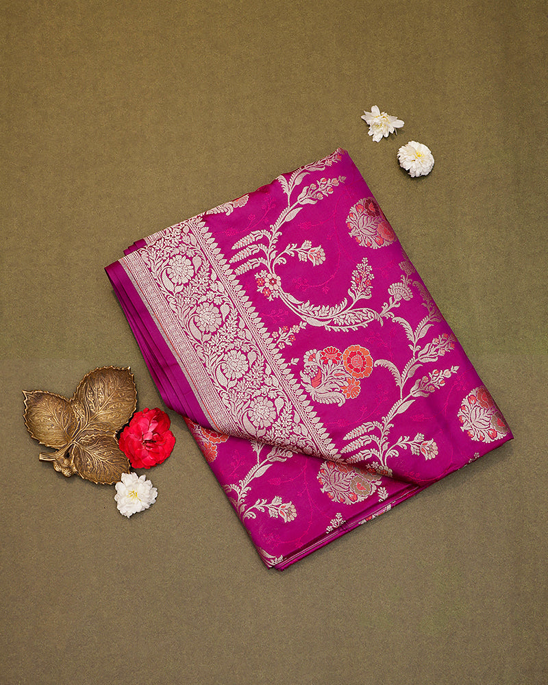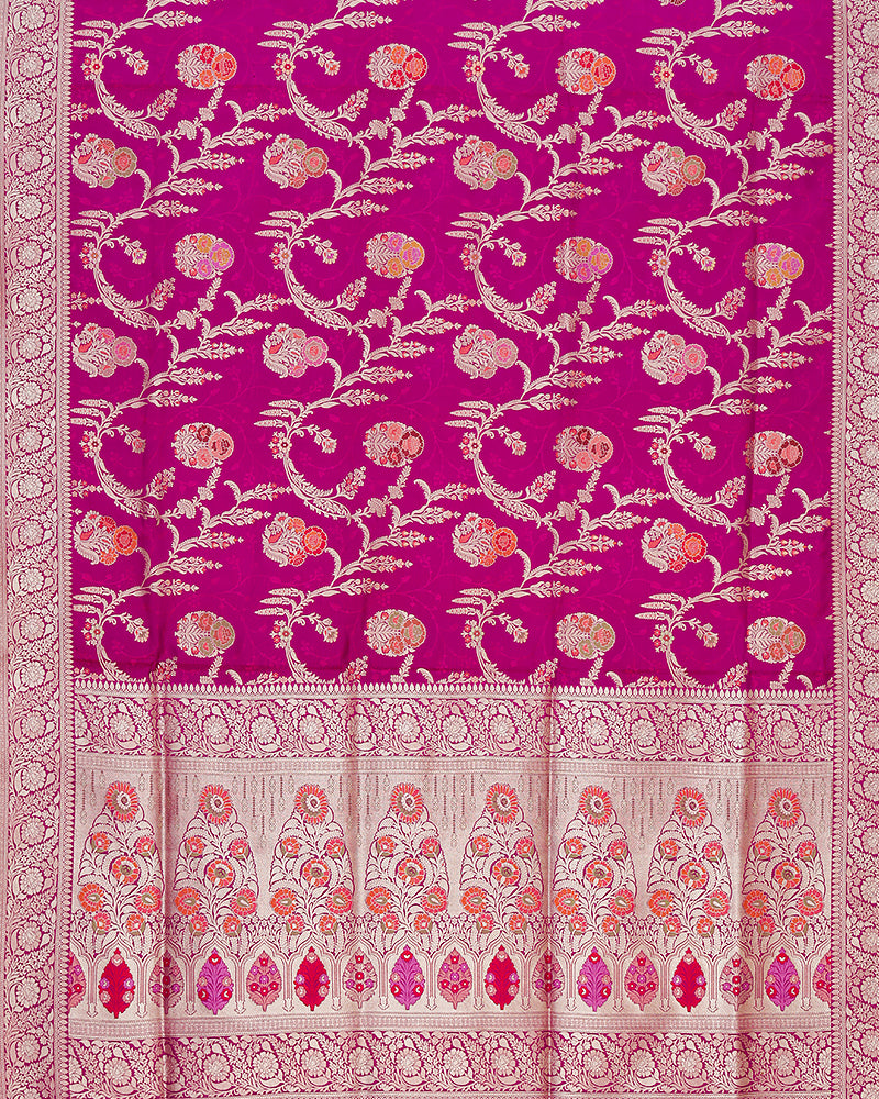 This exquisite purple Katan Banarasi silk saree showcases intricate floral meenakari butta weaving throughout, exuding elegance and charm. The saree is enhanced by a floral brocade border and a rich pallu, adding a touch of opulence. Paired with a plain blouse featuring a matching border, this ensemble is perfect for special occasions, blending timeless beauty with sophisticated craftsmanship.