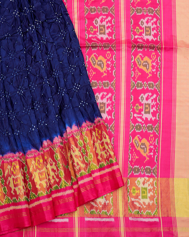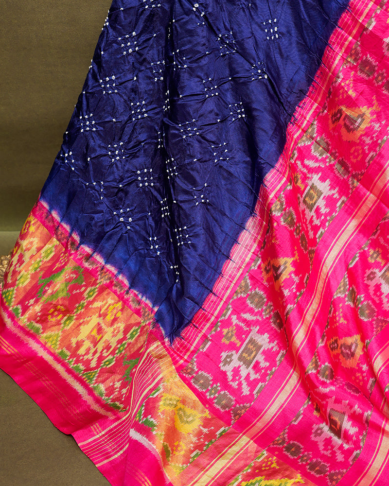 This royal blue Bandhani silk saree is adorned with intricate bandhani work throughout, creating a vibrant and captivating design. The saree features a striking pink Patola border and pallu, adding a beautiful contrast and enhancing its traditional appeal. Paired with a plain blouse that includes a matching border, this ensemble is perfect for special occasions, combining timeless elegance with exquisite craftsmanship.
