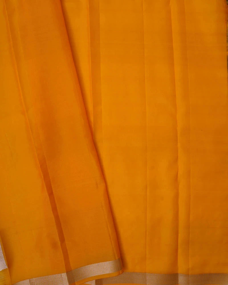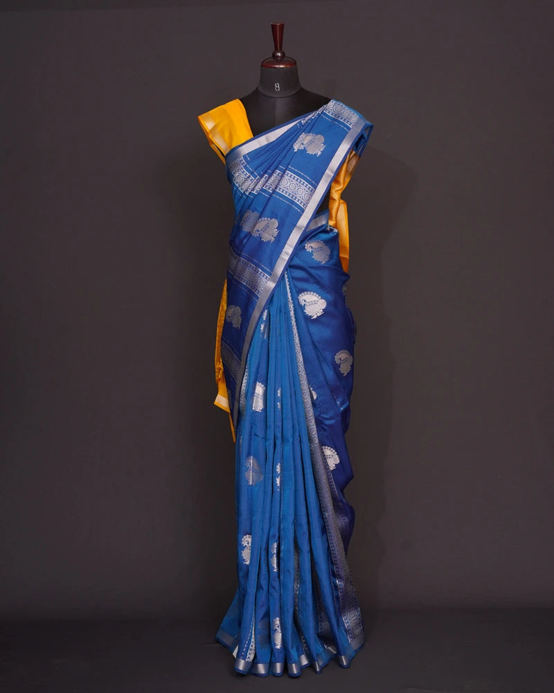 The royal blue Mysore silk saree is a striking blend of simplicity and grandeur. Adorned with vertical weaving lines, the saree exudes a refined elegance, while the delicate paisley butta weaving adds a traditional charm. The small kaddi brocade pallu complements the saree with its rich texture and intricate detailing. Paired with a contrasting yellow blouse featuring a bordered sleeve, the ensemble stands out with a vibrant pop of color. This saree is perfect for those seeking a regal yet understated look for festive occasions or formal gatherings, combining tradition with a contemporary touch.