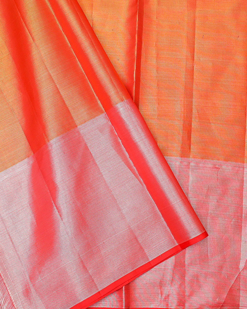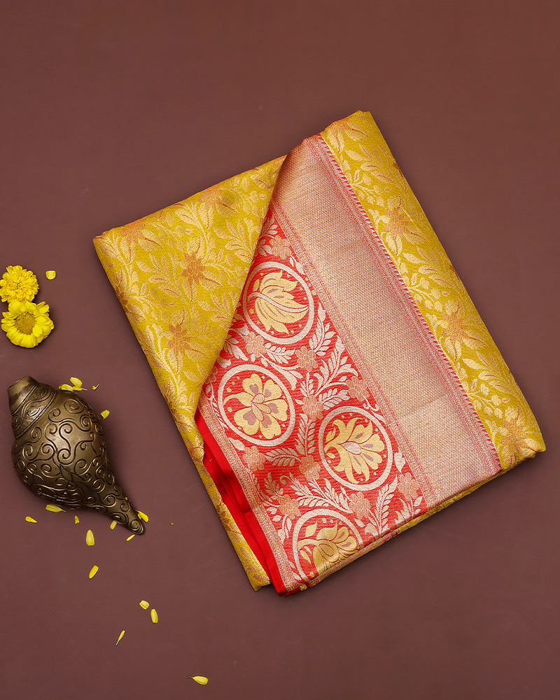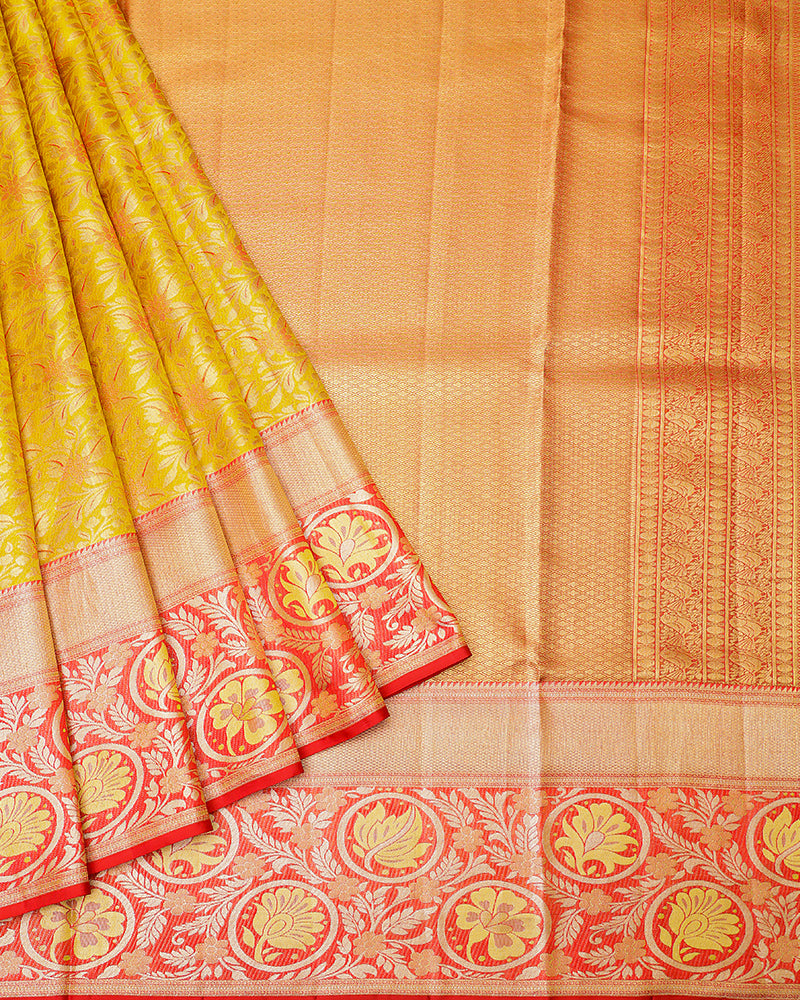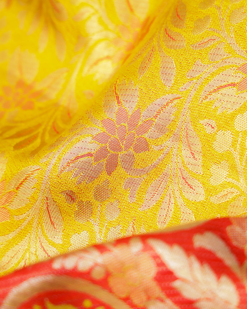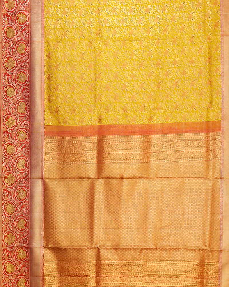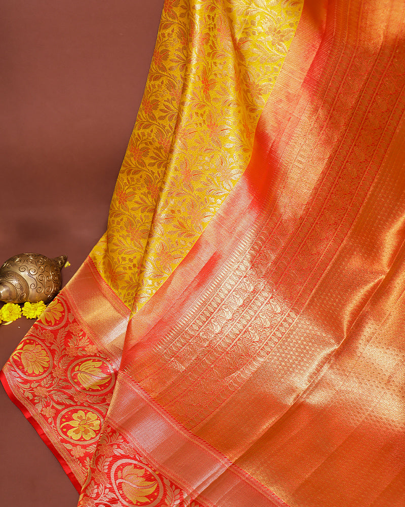 The yellow tissue Kanjivaram silk saree features floral Meenakari weaving all over. The contrasting red border showcases...
